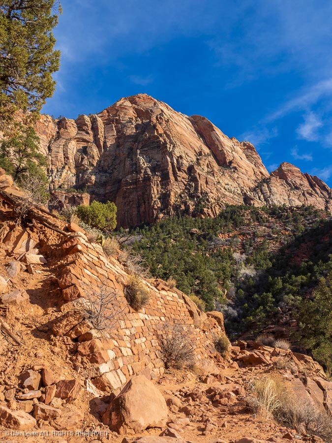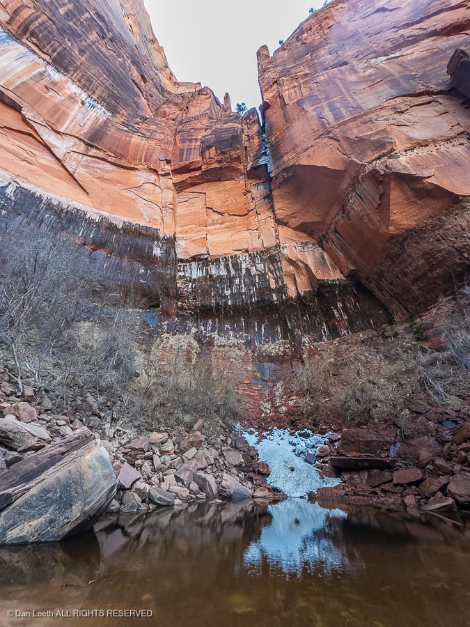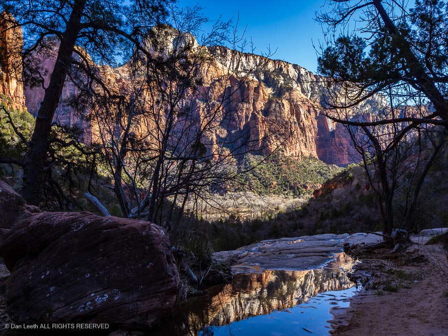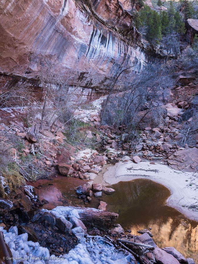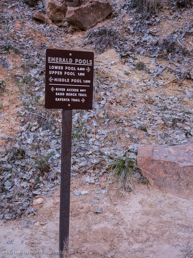 Our first hike on this trip was one we’ve done on previous winter visits to Zion. We would walk to the three Emerald Pools. The trailhead lies across the river from the lodge.