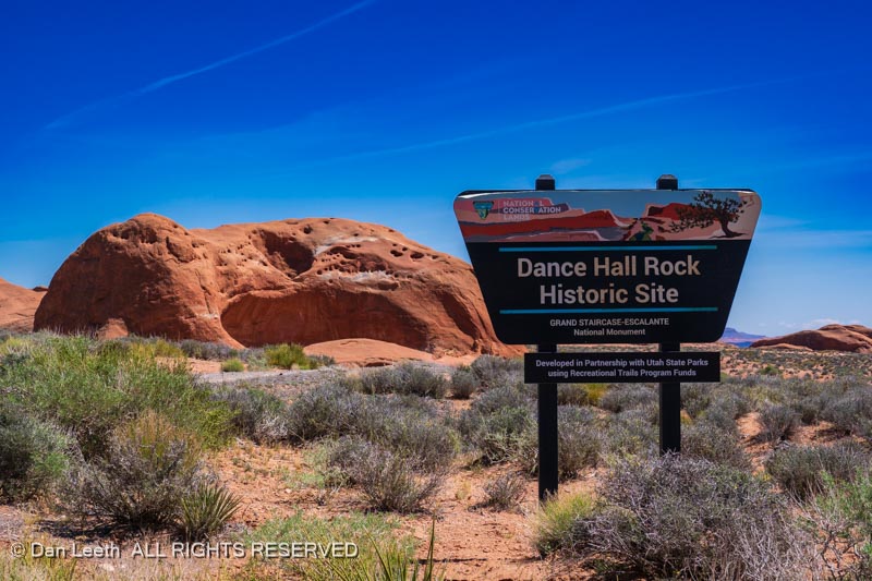 At around the halfway point on our drive, we reached Dance Hall Rock, a large sandstone alcove, where the LDS pioneers played music and held dances.